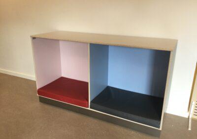 Legebænke med eller uden høj ryg. Legebænke produceres i birkekrydsfiner med mulighed for at pålægge laminat, linoleum i valgfri farve, gummi eller print efter eget valg på topplade. Under bænken er der 2-4 mobile legekasser med gummi i bunden der mindsker støjen. Antallet af legekasser afhænger af ønskede længde på bænk. På den høje ryg er der mulighed for at vælge imellem spejl, print efter eget ønske, laminat i valgfri farve, akustik med eller uden print eller billede/dokurammer der gør det let at udskifte lærings- og legemiljøer. Disse valg gør sig gældende på både for- og bagside af ryggen.